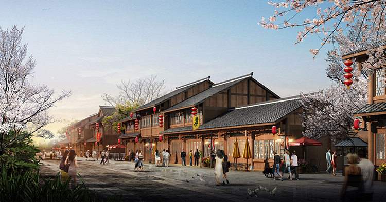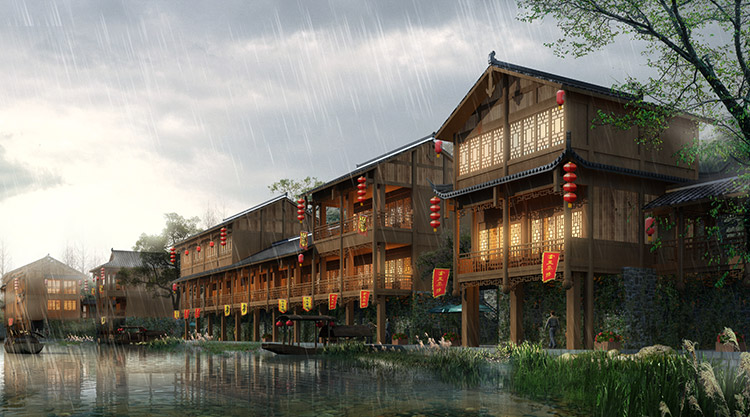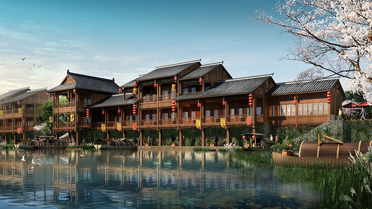 栗河吊腳樓沿河呈狹長不規(guī)則帶狀,南北向進深約25m,東西向寬約527m。項目占地面積12486.41平米(18.73畝),總建筑面積4520.87平米,分為A至J十個單體建筑,建筑層數1~2層,門面商鋪45間,沿河道均勻分布。建筑依據場地,與南側道路平行布置,建筑主入口面向場地南側道路,建筑沿河布局,底部1層為架空空間,其上為主體建筑,建筑整體風格風貌為仿明清時代,外觀簡潔、大方,給人以明朗、周正的空間體驗。契合時代新形象,尺度更為親切。場地內部景觀主要由硬質景觀與軟質景觀共同構成。硬質景觀主要包括廣場、步道和活動場地,軟質景觀主要是綠化種植。
